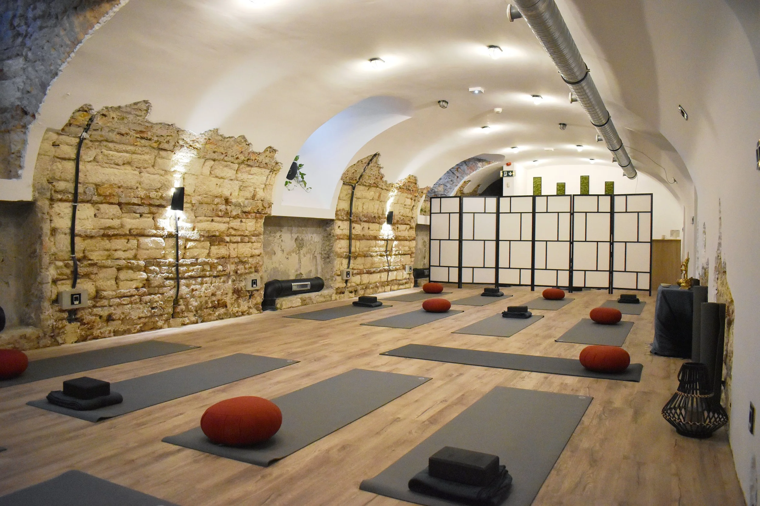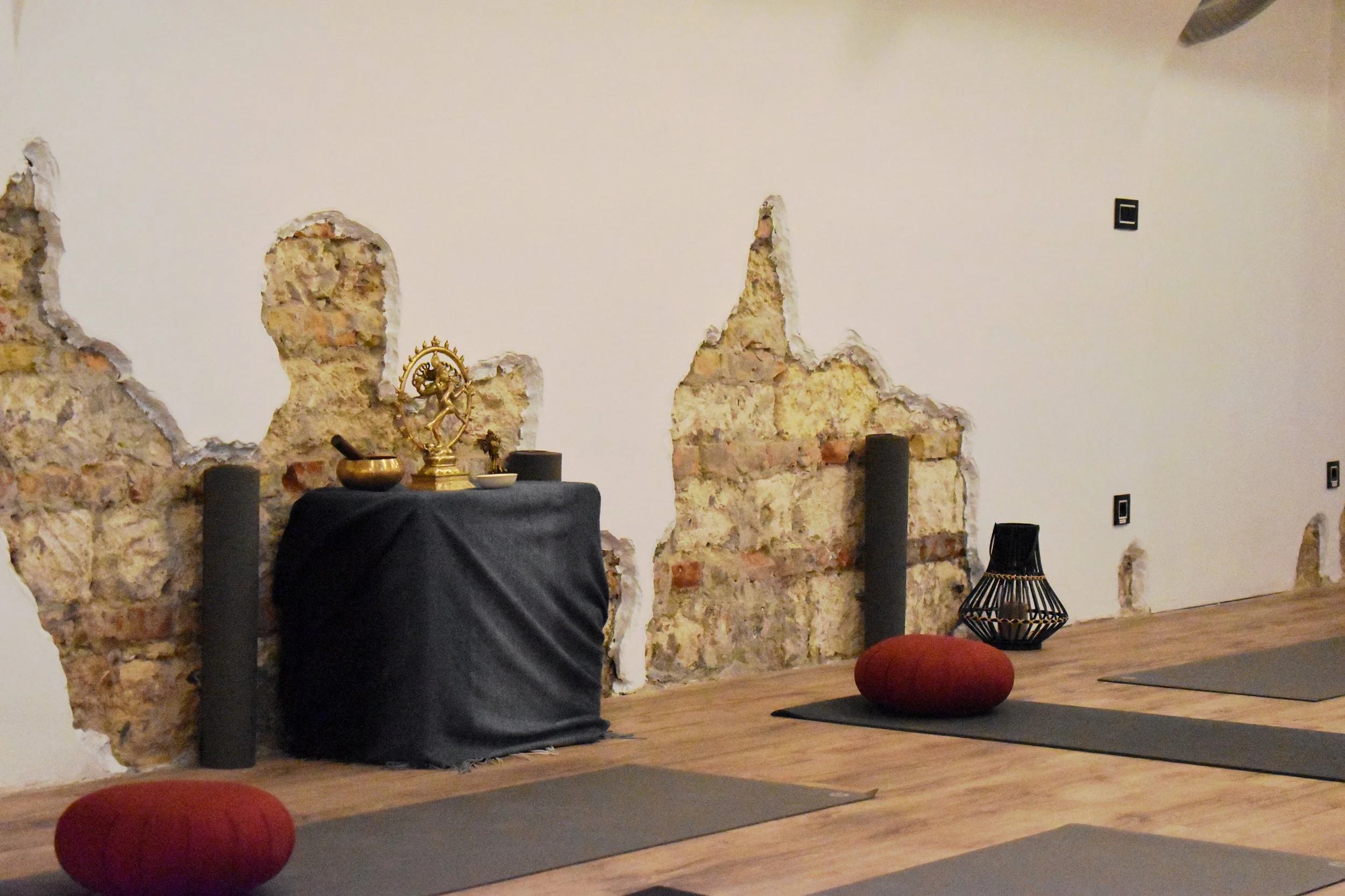 A padlófűtéssel melegített teremben jó minőségű matracok, különböző ülőpárnák, puha takarók és egyéb jógaeszközök biztosítják a zavartalan gyakorlást.